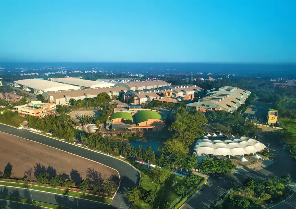 The venue features six large exhibition halls spanning 60,000 sq. m., LEED-certified green infrastructure, and a convention centre with seating for 1,500 and capacity for 10,000+ attendees. Located on Tumkur Road (NH-4), it hosts major industry events and offers ample parking with modern, sustainable amenities.